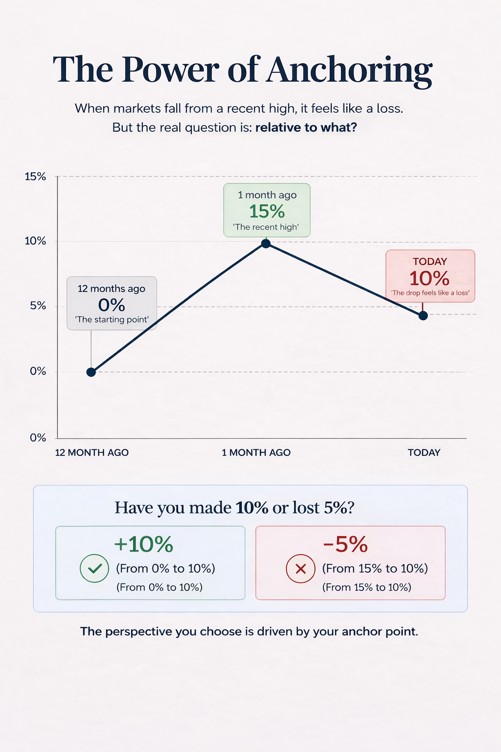 A 5% fall after a 15% rise doesn’t feel like a 10% gain. It feels like something has been taken away.